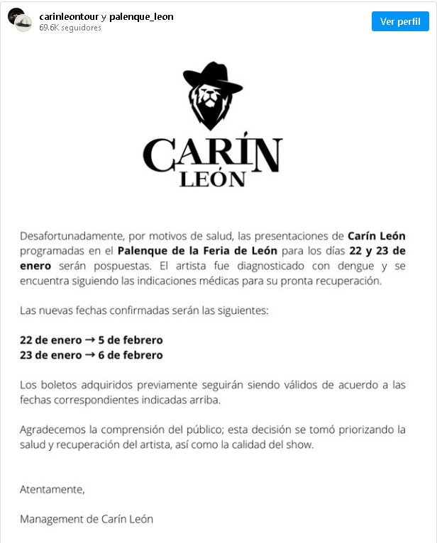 El reconocido cantante de música regional mexicana Carín León ha pospuesto sus conciertos programados en el Palenque de la Feria de León 2026 tras ser diagnosticado con dengue, una noticia que ha generado preocupación y apoyos masivos de parte de sus seguidores en redes sociales esta semana.
