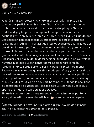 La polémica sigue creciendo en la industria musical, y ahora es Jhayco quien decidió hablar tras las críticas que ha recibido por su tema “Rosita”, una canción que ha reavivado la tensión mediática entre Christian Nodal y Cazzu.