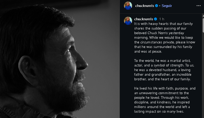 El mundo del entretenimiento está de luto tras darse a conocer el fallecimiento del actor y leyenda de las artes marciales Chuck Norris, quien murió a los 86 años. La noticia fue confirmada por su familia a través de redes sociales, donde compartieron un emotivo mensaje de despedida.