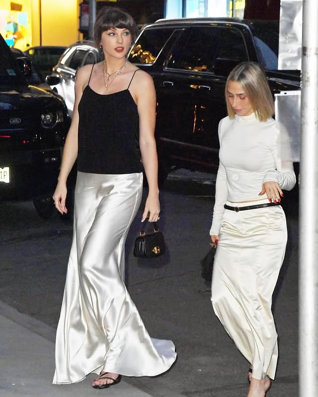 Acompañada de su amiga Ashley Avignone, Taylor disfrutó de una velada en la ciudad, pero lo que realmente captó la atención fue su outfit: sofisticado, minimalista y con claras vibras nupciales. Para muchos, este estilo no es casualidad, sino una pista más de la etapa que está viviendo.